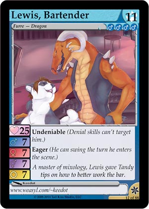Skills: Undeniable (Denial skills can't target him.) Eager (He can swing the turn he enters the scene.) Flavor Text: A master of mixology, Lewis gave Tandy tips on how to better work the bar. Artist: Keedot Edition: Caramel (4th Vanilla: Winter Break) Rarity: Rare Collector's Number: 12 / 88 | |||||||||||
