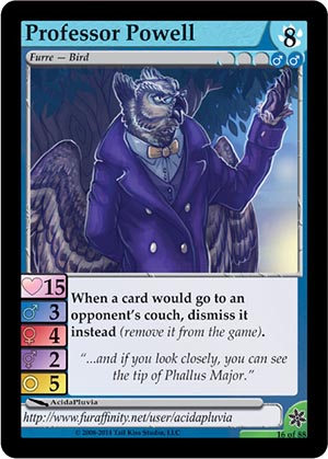 Skills: When a card would go to an opponent's couch, dismiss it instead (remove it from the game). Flavor Text: “...and if you look closely, you can see the tip of Phallus Major.” Artist: AcidaPluvia Edition: Caramel (4th Vanilla: Winter Break) Rarity: Uncommon Collector's Number: 16 / 88 | |||||||||||