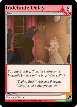 Gender: Female AP Cost: 6 GP Cost: ![]() ![]() Type: Treat Skills: You are Elusive. (You, the controller of Indefinite Delay, can't be targeted by skills.) Flavor Text: [None] Artist: Bitley Edition: Caramel (4th Vanilla: Winter Break) Rarity: Uncommon Collector's Number: 29 / 88 | |