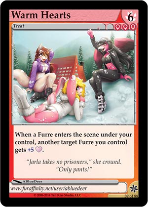 Gender: Female AP Cost: 6 GP Cost: ![]() ![]() ![]() Type: Treat Skills: When a Furre enters the scene under your control, another target Furre you control gets +5 Flavor Text: “Jarla takes no prisoners,” she crowed. ”Only pants!” Artist: ABlueDeer Edition: Caramel (4th Vanilla: Winter Break) Rarity: Rare Collector's Number: 39 / 88 | |