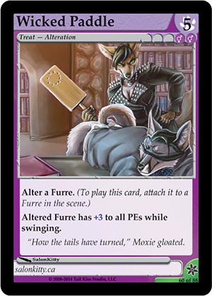 Gender: Herm AP Cost: 5 GP Cost: ![]() ![]() Type: Treat - Alteration Skills: Alter a Furre (To play this card, attach it to a Furre in the scene.) Altered Furre has +3 to all PEs while swinging. Flavor Text: “How the tails have turned,” Moxie gloated. Artist: SalonKitty Edition: Caramel (4th Vanilla: Winter Break) Rarity: Uncommon Collector's Number: 60 / 88 | |