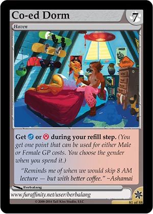 Gender: Haven AP Cost: 7 GP Cost: Type: Haven Skills: Get Flavor Text: “Reminds me of when we would skip 8 AM lecture - but with better coffee.” ~Ashamai Artist: Berbalang Edition: Caramel (4th Vanilla: Winter Break) Rarity: Rare Collector's Number: 81 / 88 | |