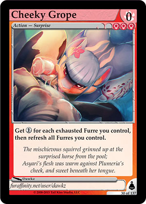 Gender: Female AP Cost: 0 GP Cost: ![]() ![]() ![]() Type: Action - Surprise Skills: Get Flavor Text: The mischievous squirrel grinned up at the surprised horse from the pool; Asyari's flesh was warm against Plumeria's cheek, and sweet beneath her tongue. Artist: Dawkz Edition: Brundali Rail Heist Rarity: Common Collector's Number: 30 / 137 | |