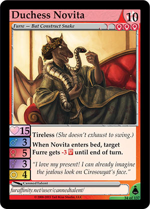 Skills: Tireless (She doesn't exhaust to swing.) When Novita enters bed, target Furre gets -3 Flavor Text: "I love my present! I can already imagine the jealous look on Cirosouyat's face." Artist: CannedTalent Edition: Brundali Rail Heist Rarity: Uncommon Collector's Number: 34 / 137 | |||||||||||