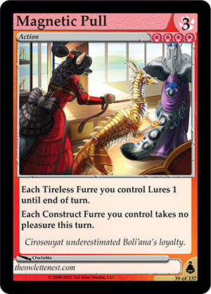 Gender: Female AP Cost: 3 GP Cost: ![]() ![]() ![]() ![]() Type: Action Skills: Each Tireless Furre you control Lures 1 until end of turn. Each Construct Furre you control takes no pleasure this turn. Flavor Text: Cirosouyat underestimated Boli'ana's loyalty. Artist: Owlette Edition: Brundali Rail Heist Rarity: Rare Collector's Number: 39 / 137 | |
