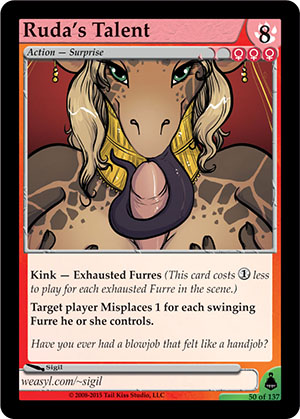 Gender: Female AP Cost: 8 GP Cost: ![]() ![]() ![]() Type: Action - Surprise Skills: Kink — Exhausted Furres (This card costs Target player Misplaces 1 for each swinging Furre he or she controls. Flavor Text: Have you ever had a blowjob that felt like a handjob? Artist: Sigil Edition: Brundali Rail Heist Rarity: Uncommon Collector's Number: 50 / 137 | |