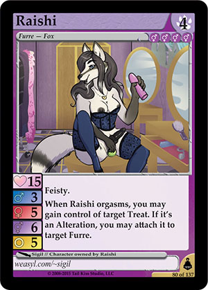 Skills: Feisty. When Raishi orgasms, you may gain control of target Treat. If it's an Alteration that can alter a Furre, you may attach it to target Furre. Flavor Text: [None] Artist: Sigil Edition: Brundali Rail Heist Rarity: Rare Collector's Number: 80 / 137 | |||||||||||