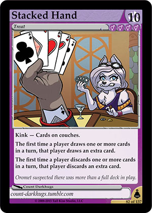Gender: Herm AP Cost: 10 GP Cost: ![]() ![]() ![]() ![]() Type: Treat Skills: Kink — Cards on couches. The first time a player draws any number of cards in a turn, that player draws an extra card. The first time a player discards any number of cards in a turn, that player discards an extra card. Flavor Text: Oromet suspected there was more than a full deck in play. Artist: Count Darkhugs Edition: Brundali Rail Heist Rarity: Rare Collector's Number: 82 / 137 | |