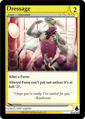 Gender: Otherkind AP Cost: 2 GP Cost: ![]() Type: Treat - Alteration Skills: Alter a Furre. Altered Furre can't put out unless it's at full Flavor Text: "I hope you're ready. I've waited for you." ~Rambutan Artist: Frienem Edition: Brundali Rail Heist Rarity: Common Collector's Number: 89 / 137 | |