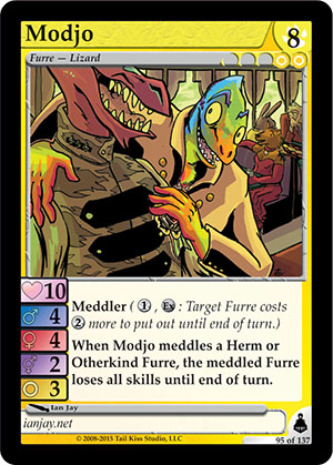 Skills: Meddler ( When Modjo meddles a Herm or Otherkind Furre, the meddled Furre loses all skills until end of turn. Flavor Text: [None] Artist: Ian Jay Edition: Brundali Rail Heist Rarity: Common Collector's Number: 95 / 137 | |||||||||||
