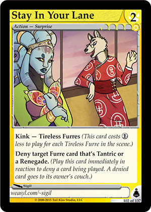 Gender: Otherkind AP Cost: 2 GP Cost: ![]() Type: Action - Surprise Skills: Kink — Tireless Furres (This card costs Deny target Furre card that's Tantric or a Renegade. (Play this card immediately in reaction to deny a card being played. A denied card goes to its owner's couch.) Flavor Text: [None] Artist: Sigil Edition: Brundali Rail Heist Rarity: Common Collector's Number: 102 / 137 | |
