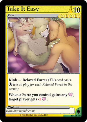 Gender: Otherkind AP Cost: 10 GP Cost: ![]() ![]() ![]() ![]() ![]() Type: Treat Skills: Kink — Relaxed Furres (This card costs When a Furre you control gains any Flavor Text: [None] Artist: Maim Edition: Brundali Rail Heist Rarity: Uncommon Collector's Number: 104 / 137 | |