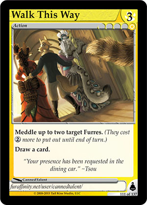 Gender: Otherkind AP Cost: 3 GP Cost: ![]() Type: Action Skills: Meddle up to two target Furres. (They cost Draw a card. Flavor Text: "Your presence has been requested in the dining car." ~ Tsou Artist: CannedTalent Edition: Brundali Rail Heist Rarity: Common Collector's Number: 111 / 137 | |