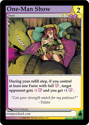 Gender: Herm / Otherkind AP Cost: 2 GP Cost: ![]() ![]() ![]() Type: Treat Skills: During your refill step, if you control at least one Furre with full Flavor Text: "Can your strength match for my patience?" ~Tulatu Artist: Nero O'Reilly Edition: Brundali Rail Heist Rarity: Uncommon Collector's Number: 123 / 137 | |