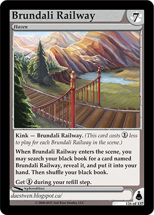 Gender: Haven AP Cost: 7 GP Cost: Type: Haven Skills: Kink — Brundali Railway. (This card costs When Brundali Railway enters the scene, you may search your black book for a card named Brundali Railway, reveal it, and put it into your hand. Then shuffle your black book. Get Flavor Text: Rolling hills; quiet and intimate. Artist: Aphroditus Edition: Brundali Rail Heist Rarity: Common Collector's Number: 126 / 137 | |