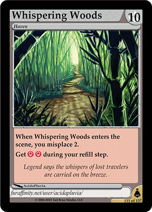 Gender: Haven AP Cost: 10 GP Cost: Type: Haven Skills: When Whispering Woods enters the scene, you misplace 2. Get Flavor Text: Legend says the whispers of lost travelers are carried on the breeze. Artist: AcidaPluvia Edition: Brundali Rail Heist Rarity: Rare Collector's Number: 133 / 137 | |