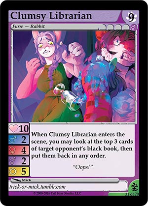 Skills: When Clumsy Librarian enters the scene, you may look at the top 3 cards of target opponent's black book, then put them back in any order. Flavor Text: "Oops!" Artist: Mick Edition: Climax Rarity: Uncommon Collector's Number: 31 / 79 |