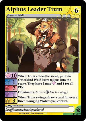 Skills: When Trum enters the scene, put two Otherkind Wolf Furre tokens into the scene. They have 3 max Dominant (He costs When Trum swings, draw a card for every three swinging Wolves you control. Flavor Text: [None] Artist: spackered Edition: Climax Rarity: Uncommon Collector's Number: 45 / 79 | |||||||||||