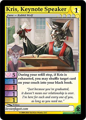 Skills: During your refill step, if Kris is exhausted, you may shuffle target card on your couch into your black book. Flavor Text: "Just because you've graduated, it doesn't mean our relationship is over. I'm here for each and every one of you, as long as you need me." Artist: Tidma Edition: Climax Rarity: Uncommon Collector's Number: 52 / 79 |