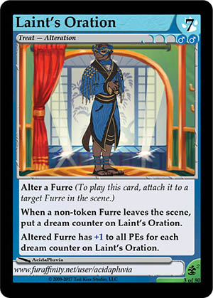 Gender: Male AP Cost: 7 GP Cost: ![]() ![]() Type: Treat - Alteration Skills: Alter a Furre. When a non-token Furre leaves the scene, put a dream counter on Laint's Oration. Altered Furre has +1 to all PEs for each dream counter on Laint's Oration. Flavor Text: [None] Artist: AcidaPluvia Edition: Climax 2 Rarity: Uncommon Collector's Number: 3 / 80 | |