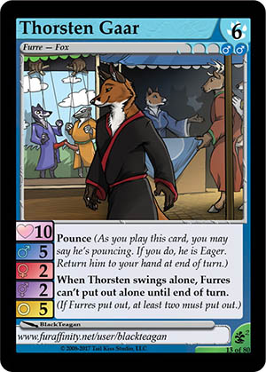 Skills: Pounce. When Thorsten swings alone, Furres can't put out alone until end of turn. Flavor Text: [None] Artist: BlackTeagan Edition: Climax 2 Rarity: Uncommon Collector's Number: 13 / 80 | |||||||||||
