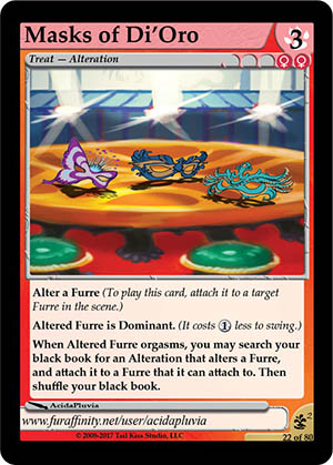 Gender: Female AP Cost: 3 GP Cost: ![]() ![]() Type: Treat - Alteration Skills: Alter a Furre. Altered Furre is Dominant. When Altered Furre orgasms, you may search your black book for an Alteration that alters a Furre, and attach it to a Furre that it can attach to. Then shuffle your black book. Flavor Text: [None] Artist: AcidaPluvia Edition: Climax 2 Rarity: Rare Collector's Number: 22 / 80 |