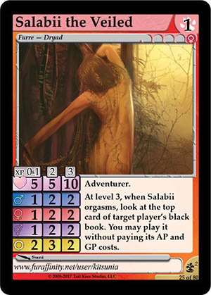 Skills: Lv0: 5 // 1/1/1/2, Lv2: 5 // 2/2/2/3, Lv3: 10 // 2/2/2/2. Adventurer. At level 3, when Salabii orgasms, look at the top card of target player's black book. You may play it without paying its AP and GP costs.