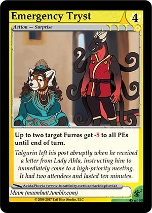 Gender: Otherkind AP Cost: 4 GP Cost: ![]() Type: Action - Surprise Skills: Up to two target Furres get -5 to all PEs until end of turn. Flavor Text: Talgurin left his post abruptly when he received a letter from Lady Ahla, instructing him to immediately come to a high-priority meeting. It had two attendees and lasted ten minutes. Artist: AcidaPluvia Edition: Climax 2 Rarity: Uncommon Collector's Number: 45 / 80 | |