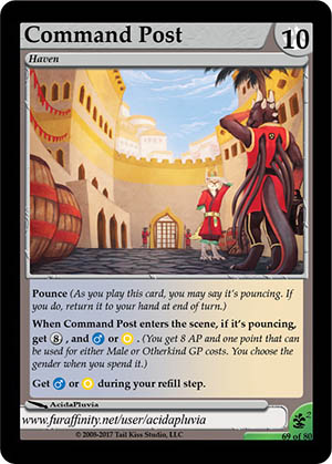 Gender: Haven AP Cost: 10 GP Cost: - Type: Haven Skills: Pounce. When Command Post enters the scene, if it's pouncing, get :8ap:, and :mgp: or :ogp:. Get :mgp: or :ogp: during your refill step. Flavor Text: [None] Artist: AcidaPluvia Edition: Climax 2 Rarity: Uncommon Collector's Number: 69 / 80 |