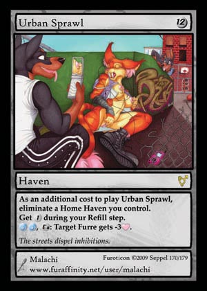 Gender: Haven AP Cost: 12 GP Cost: Type: Haven Skills: As an extra cost to play Urban Sprawl, eliminate a Home Haven you control. Get Flavor Text: The streets dispel inhibitions. Artist: Malachi Edition: 1st Vanilla Rarity: Rare Collector's Number: 170 / 179 | |