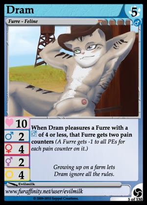 Skills: When Dram pleasures a Furre with a Flavor Text: Growing up on the farm lets Dream ignore all the rules. Artist: Evilmilk Edition: Triskelion Rarity: Common Collector's Number: 5 / 130 | |||||||||||