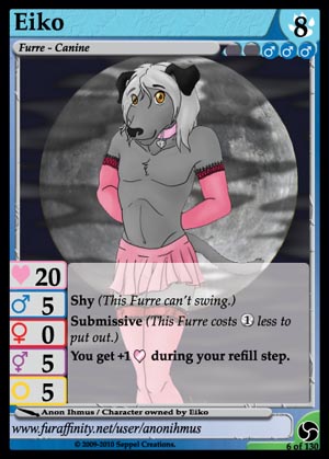 Skills: Shy (This Furre can't swing) Submissive (This Furre costs You get +1 Flavor Text: [None] Artist: Anon Ihmus Edition: Triskelion Rarity: Uncommon Collector's Number: 6 / 130 | |||||||||||