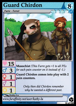 Skills: Masochist (This Furre gets +1 to all PEs for each pain counter on it instead of -1.) Guard Chirdon enters the scene with 2 pain counters. Flavor Text: Only then did Chirdon remember why he wanted a different post. Artist: Kathy-Lu Edition: Triskelion Rarity: Common Collector's Number: 10 / 130 | |||||||||||