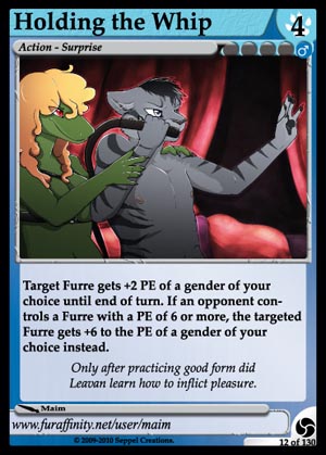 Gender: Male AP Cost: 4 GP Cost: ![]() Type: Action - Surprise Skills: Target Furre gets +2 PE of a gender of your choice until end of turn. If an opponent controls a Furre with a PE of 6 or more, the targeted Furre gets +6 to the PE of a gender of your choice instead. Flavor Text: Only after practicing good form did Leavan learn how to inflict pleasure. Artist: Maim Edition: Triskelion Rarity: Common Collector's Number: 12 / 130 | |