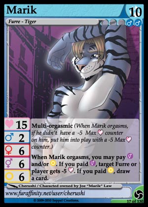 Skills: Multi-orgasmic (When Marik orgasms, if he didn't have a -5 Max When Marik orgasms, you may pay Flavor Text: [None] Artist: Cherushi Edition: Triskelion Rarity: Uncommon Collector's Number: 17 / 130 | |||||||||||
