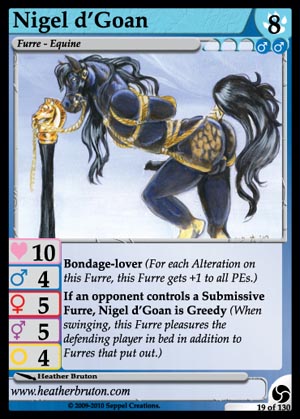 Skills: Bondage-lover (For each Alteration on this Furre, this Furre gets +1 to all PEs.) If an opponent controls a submissive Furre, Nigel d'Goan is Greedy (When swinging, this Furre pleasures the defending player in bed in addition to Furres that put out.) Flavor Text: [None] Artist: Heather Bruton Edition: Triskelion Rarity: Common Collector's Number: 19 / 130 | |||||||||||