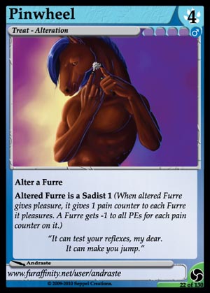 Gender: Male AP Cost: 4 GP Cost: ![]() Type: Treat - Alteration Skills: Alter a Furre Altered Furre is a Sadist 1 (When altered Furre gives pleasure, it gives 1 pain counter to each Furre it pleasures. A Furre gets -1 to all PEs for each pain counter on it.) Flavor Text: "It can test your reflexes, my dear. It can make you jump." Artist: Andraste Edition: Triskelion Rarity: Uncommon Collector's Number: 22 / 130 | |