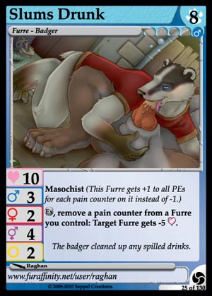 Skills: Masochist (This Furre gets +1 to all PEs for each pain counter on it instead of -1.) Flavor Text: The badger cleaned up any spilled drinks. Artist: Raghan Edition: Triskelion Rarity: Common Collector's Number: 25 / 130 | |||||||||||