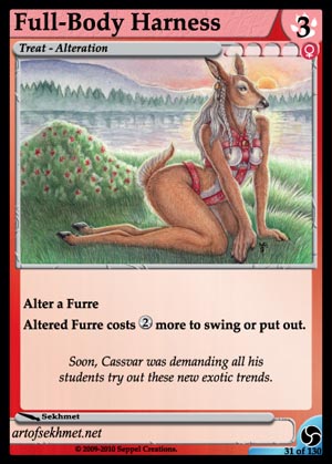 Gender: Female AP Cost: 3 GP Cost: ![]() Type: Treat - Alteration Skills: Alter a Furre Altered Furre costs Flavor Text: Soon, Cassvar was demanding all his students try out these new exotic trends. Artist: Sekhmet Edition: Triskelion Rarity: Starter-Only Collector's Number: 31 / 130 | |