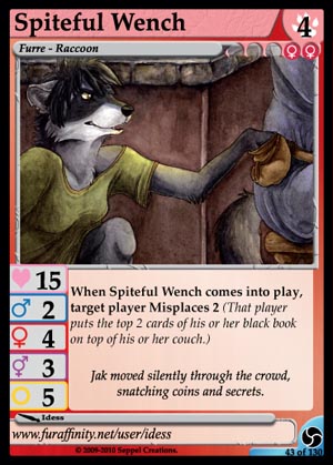 Skills: When Spiteful Wench enters the scene, target player Misplaces 2 (That player puts the top 2 cards of his or her black book on top of his or her couch.) Flavor Text: Jak moved silently through the crowd, snatching coins and secrets. Artist: Idess Edition: Triskelion Rarity: Starter-Only Collector's Number: 43 / 130 | |||||||||||