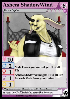 Skills: Male Furres you control get +1 to all PEs. Ashera ShadowWind gets +1 to all PEs for each Male Furre you control. Flavor Text: [None] Artist: Lamoxlamae Edition: Triskelion Rarity: Common Collector's Number: 52 / 130 | |||||||||||