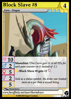 Skills: Masochist (This Furre gets +1 to all PEs for each pain counter on it instead of -1.) Flavor Text: Sold as a status symbol, the drake was treated more as a pet than a sexual being. Artist: Thorndraco Edition: Triskelion Rarity: Common Collector's Number: 77 / 130 | |||||||||||
