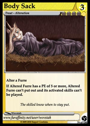 Gender: Otherkind AP Cost: 3 GP Cost: ![]() Type: Treat - Alteration Skills: Alter a Furre If Altered Furre has a PE of 5 or more, Altered Furre can't put out and its activated skills can't be played. Flavor Text: The skilled know when to stay put. Artist: Wovstah Edition: Triskelion Rarity: Common Collector's Number: 79 / 130 | |
