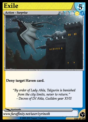 Gender: Otherkind / Male AP Cost: 5 GP Cost: ![]() ![]() Type: Action - Surprise Skills: Deny target Haven card. Flavor Text: "By order of Lady Ahla, Talgurin is banished from the city limits, never to return." ~ Decree of Di'Ahla, Guilden year XVII Artist: Syrinoth Edition: Triskelion Rarity: Rare Collector's Number: 112 / 130 | |