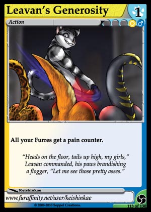 Gender: Otherkind / Male AP Cost: 1 GP Cost: ![]() ![]() Type: Action Skills: All your Furres get a pain counter. Flavor Text: "Heads on the floor, tails up high, my girls." Leavan commanded, his paws brandishing a flogger, "Let me see those pretty asses." Artist: Keishinkae Edition: Triskelion Rarity: Uncommon Collector's Number: 113 / 130 | |