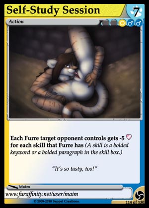 Gender: Otherkind / Male AP Cost: 7 GP Cost: ![]() ![]() ![]() Type: Action Skills: Each Furre target opponent controls gets -5 Flavor Text: "It's so tasty, too!" Artist: Maim Edition: Triskelion Rarity: Rare Collector's Number: 114 / 130 | |