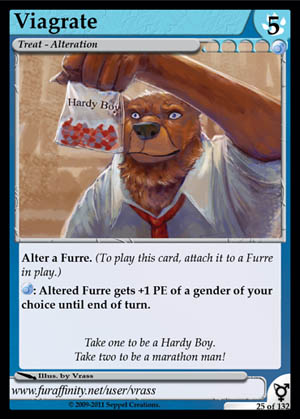 Gender: Male AP Cost: 5 GP Cost: ![]() Type: Treat - Alteration Skills: Alter a Furre. (To play this card, attach it to a Furre in the scene.) ![]() Flavor Text: Take one to be a Hardy Boy. Take two to be a marathon man! Artist: Vrass Edition: 2nd Vanilla Rarity: Common Collector's Number: 25 / 132 |