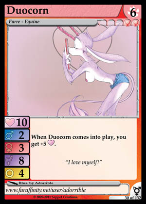 Skills: When Duocorn enters the scene, you get +5 ![]() Flavor Text: "I love myself!" Artist: Adorrible Edition: 2nd Vanilla Rarity: Common Collector's Number: 30 / 132 |