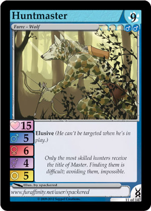 Skills: Elusive (He can't be targeted when he's in the scene.) Flavor Text: Only the most skilled hunters receive the title of Master. Finding them is difficult; avoiding them, impossible. Artist: spackered Edition: Tribes of Tanglebrook Rarity: Common Collector's Number: 11 / 147 | |||||||||||
