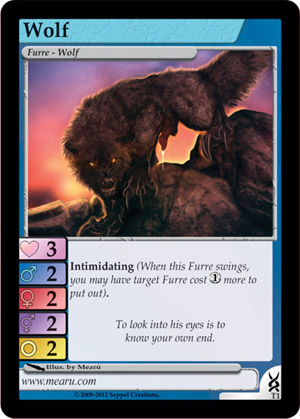Skills: Intimidating (When this Furre swings, you may have target Furre cost Flavor Text: To look into his eyes is to know your own end. Artist: MearĂº Edition: Token Cards Rarity: Common Collector's Number: 1 / * | |||||||||||